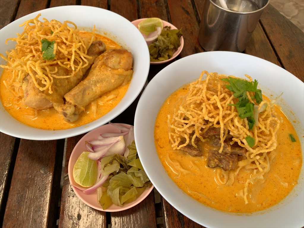 ①は牛肉カオソーイで②は鶏肉カオソーイ
